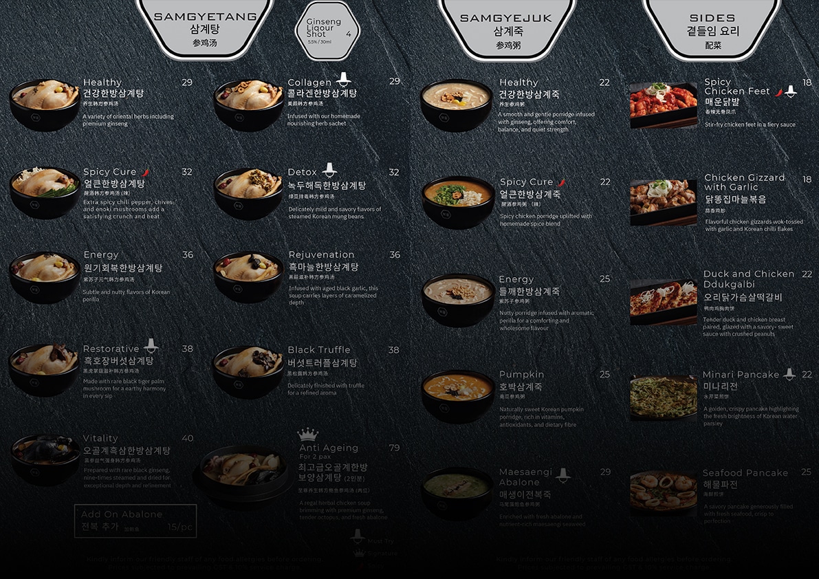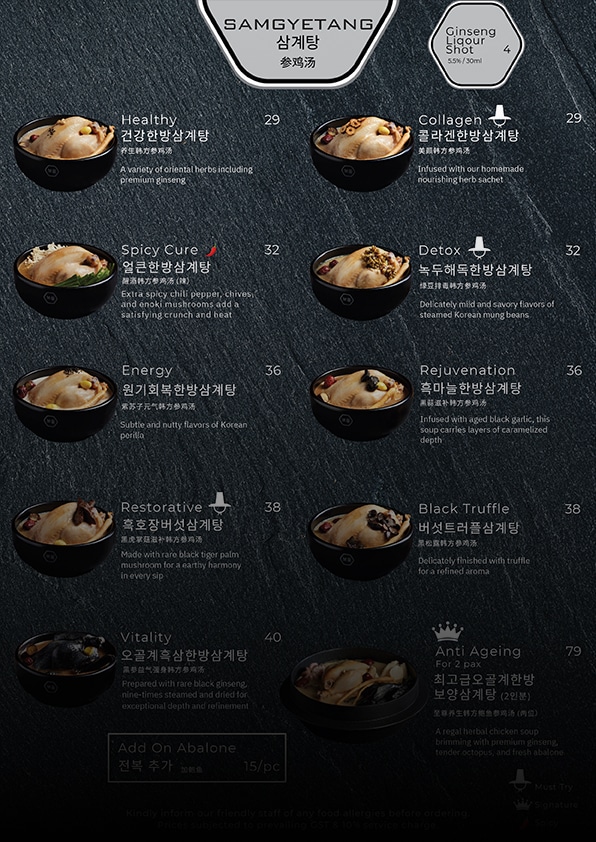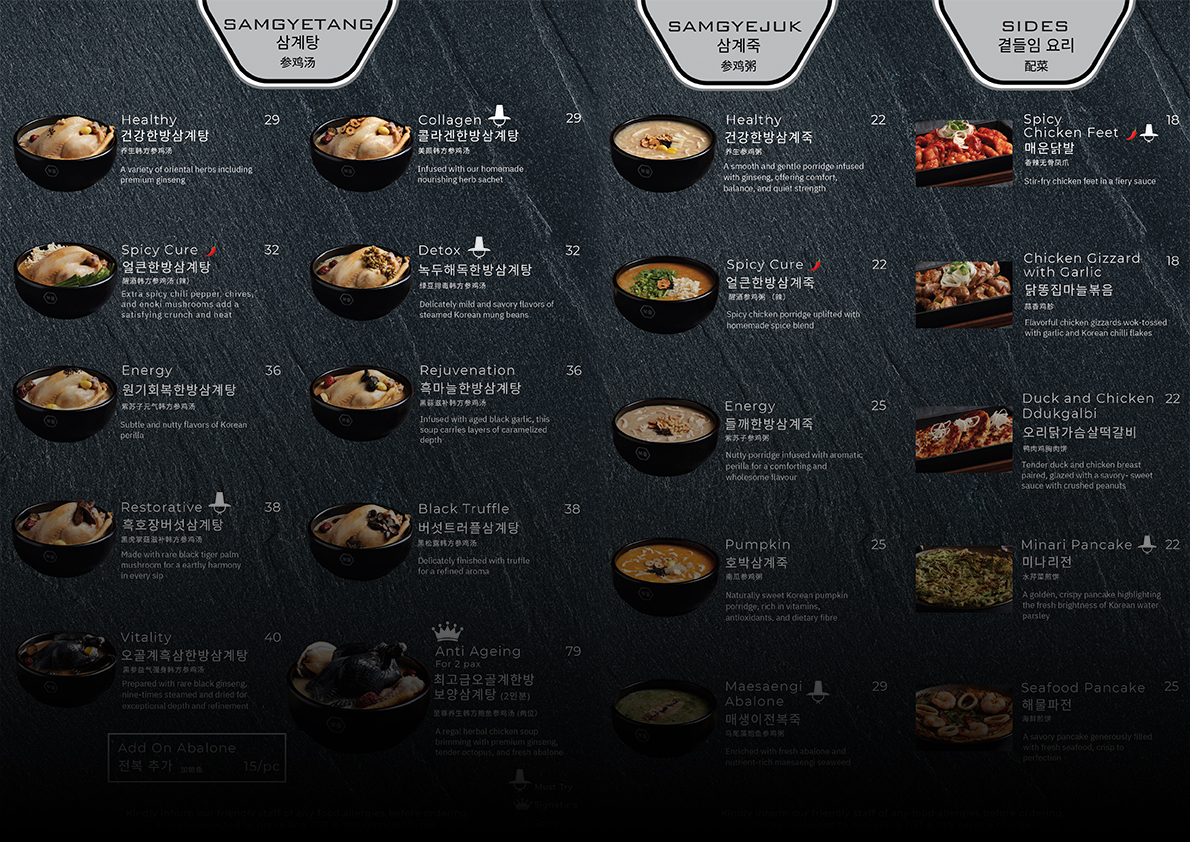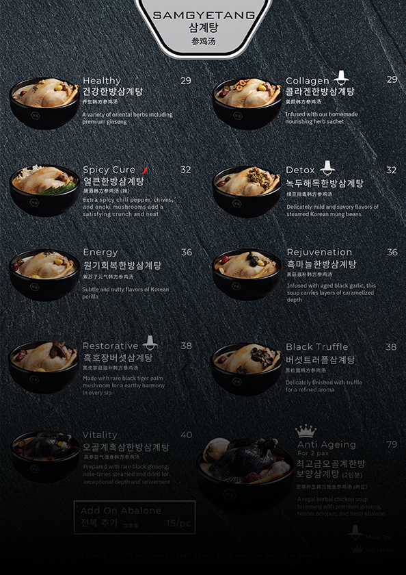 Every soup is simmered in a hanging broth brewed from 18 carefully selected herbs, balancing rich flavour with the healing essence of traditional Korean wellness cuisine.